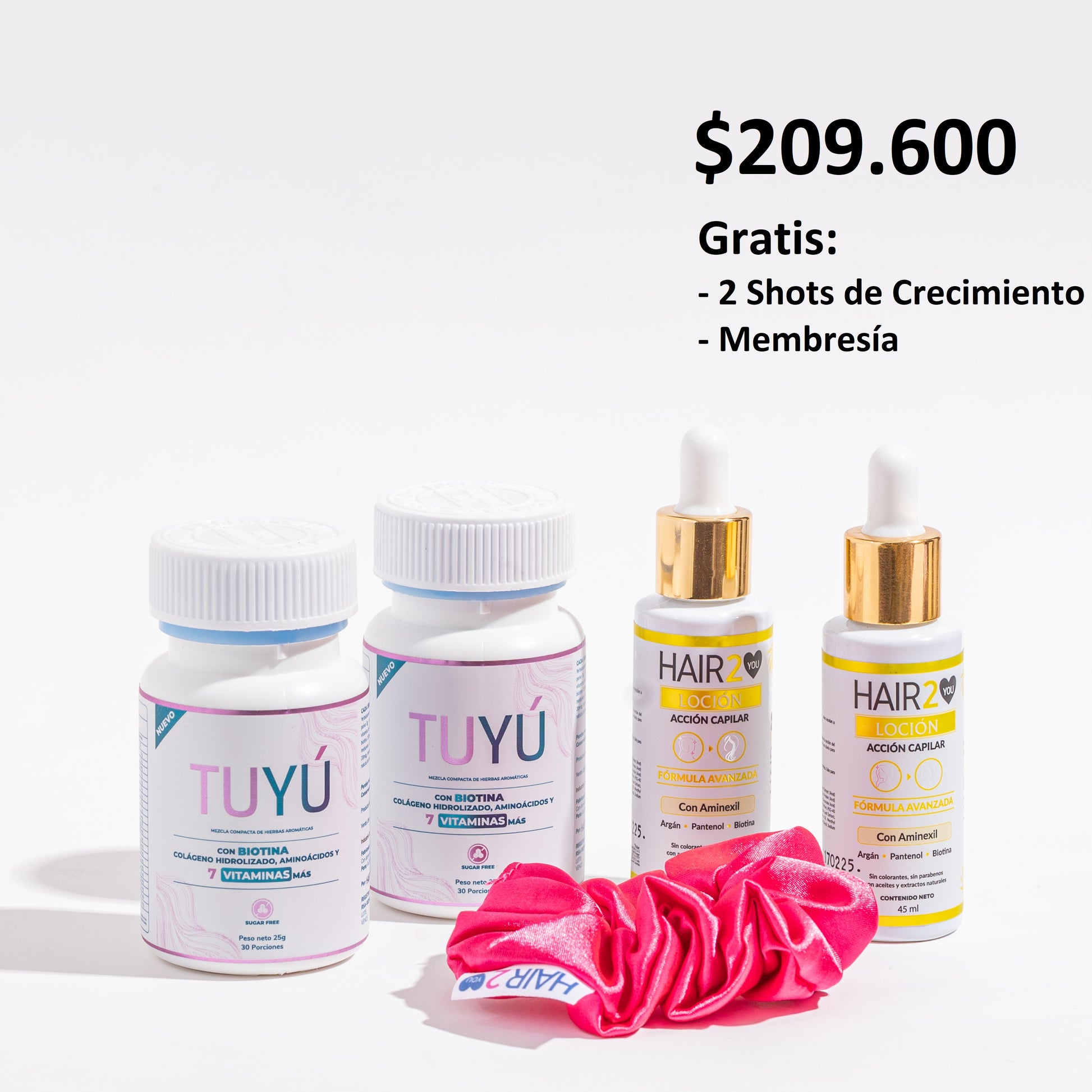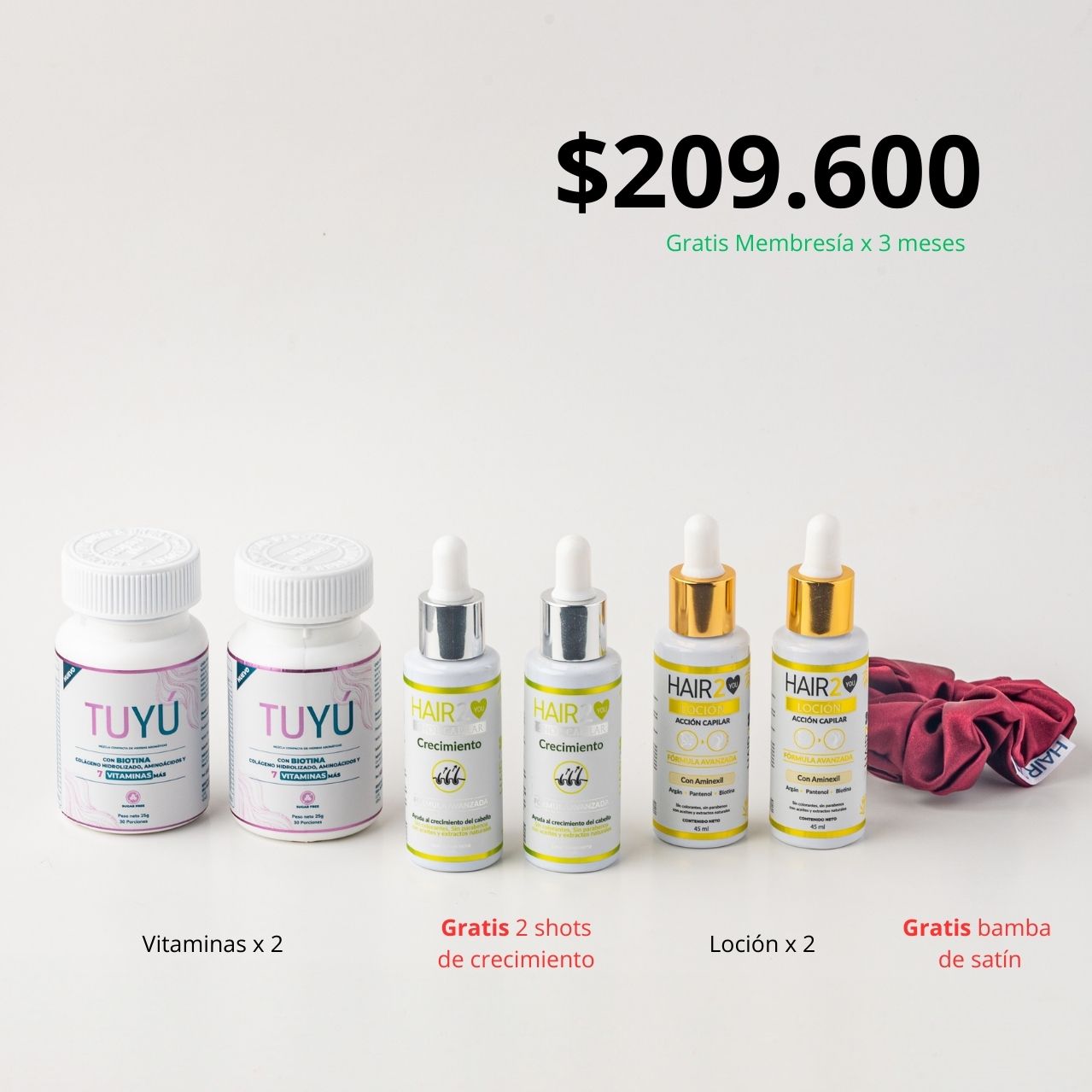 Con este kit de 2 meses de tratamiento completo, recibes todo lo que necesitas para nutrir, estimular y acelerar el crecimiento, además de gratis una Bamba de Satín, dos Shots de Crecimiento Acelerado y 3 meses de Membresía Hair2You (productos gratis y precios exclusivos).