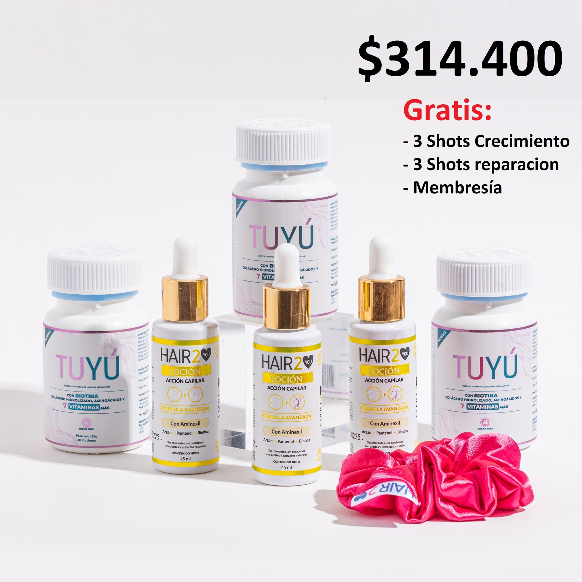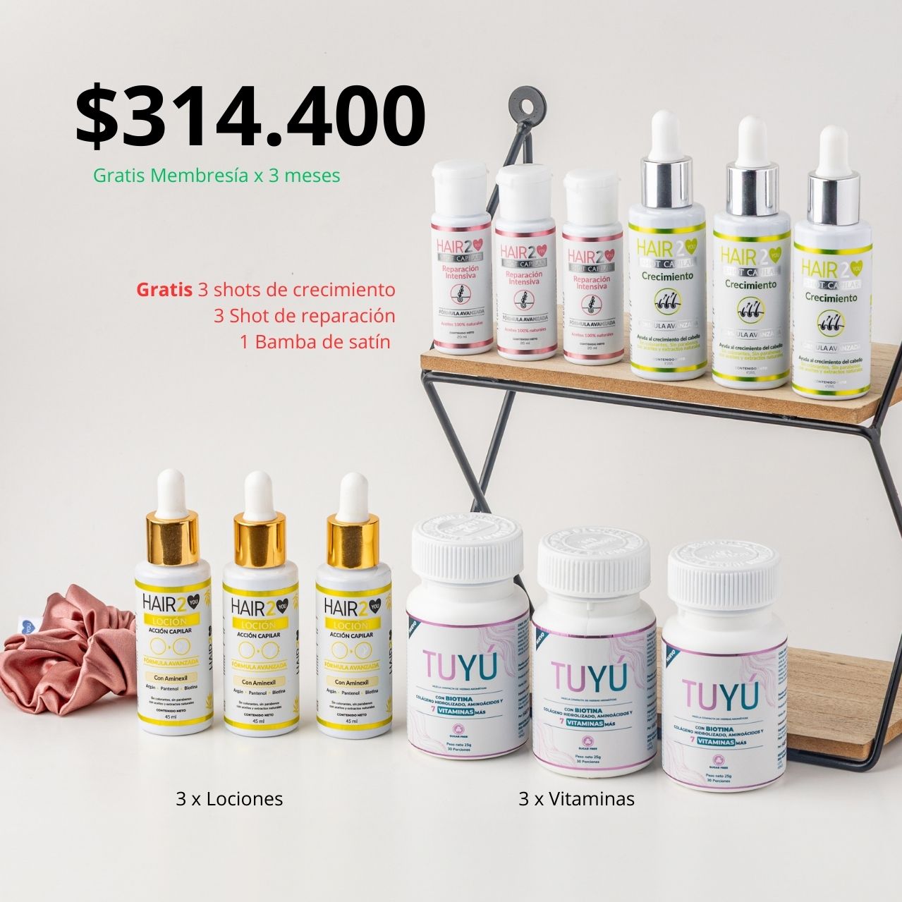 Con este kit de 3 meses de tratamiento, tendrás todo lo que necesitas para nutrir desde adentro y estimular los folículos cada día para acelerar el crecimiento, además de gratis una Bamba de Satín, tres Shots de Reparación Intensiva, tres Shots de Crecimiento Acelerado y 3 meses de Membresía Hair2You (productos gratis y precios exclusivos).