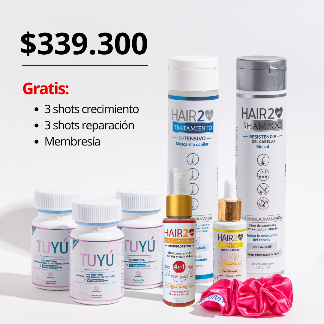 Este kit de 3 meses de tratamiento ofrece todo lo necesario para nutrir desde adentro, estimular el crecimiento y proteger el cabello, además de gratis una Bamba de Satín, tres Shots de Crecimiento, tres Shots de Reparación Intensiva y 3 meses de Membresía Hair2You (productos gratis y precios exclusivos).