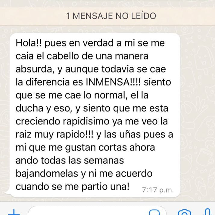 • 3 meses de tratamiento (mínimo recomendado)Una vez completes los 3 meses tendrás un cabello sin caída excesiva, sino lo normal para renovarse, lo sentirás mas suave, sedoso y muy saludable, tus uñas mas fuertes que nunca y veras como tu piel se ha rejuvenecido